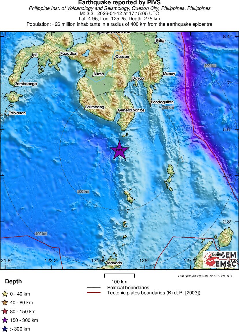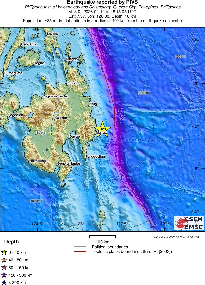| 3 | 18 | 3636 | 04:15 | Link | Terremoto menor - MINDANAO, PHILIPPINES - Hoje |