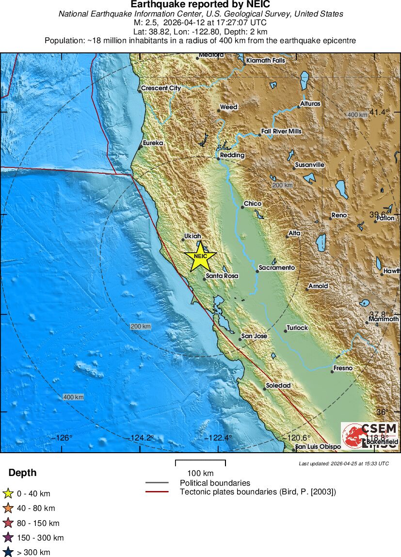 | 2.6 | 5.3 | 7863 | 03:27 | Link | Terremoto menor - NORTHERN CALIFORNIA - Hoje |