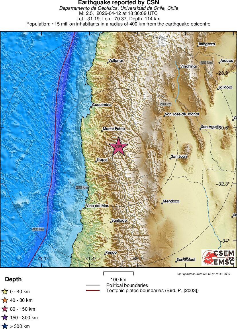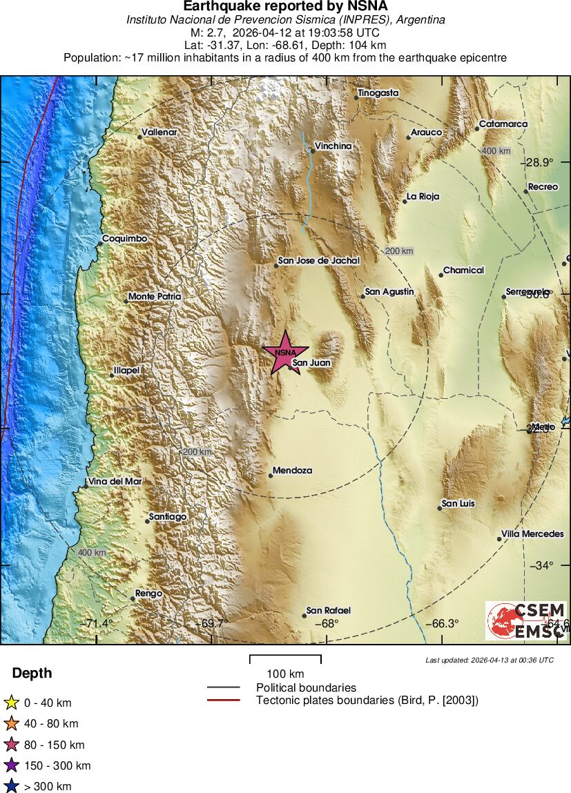 | 2.5 | 113.8 | 6848 | 04:36 | Link | Terremoto menor - SAN JUAN, ARGENTINA - Hoje |