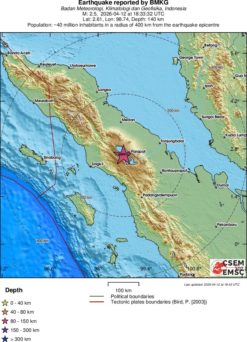 | 2.5 | 140 | 4344 | 04:33 | Link | Terremoto menor - NORTHERN SUMATRA, INDONESIA - Hoje |
