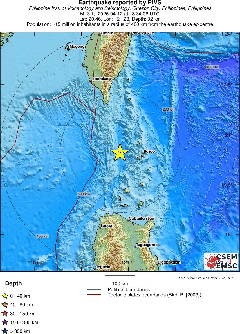 | 3.1 | 32 | 4614 | 04:34 | Link | Terremoto menor - BATAN ISL REGION, PHILIPPINES - Hoje |