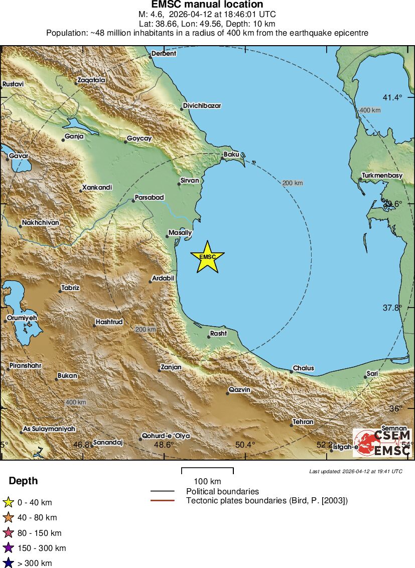 | 4.6 | 10 | 8298 | 04:46 | Link | Terremoto leve - CASPIAN SEA, OFFSHORE AZERBAIJAN - Hoje |