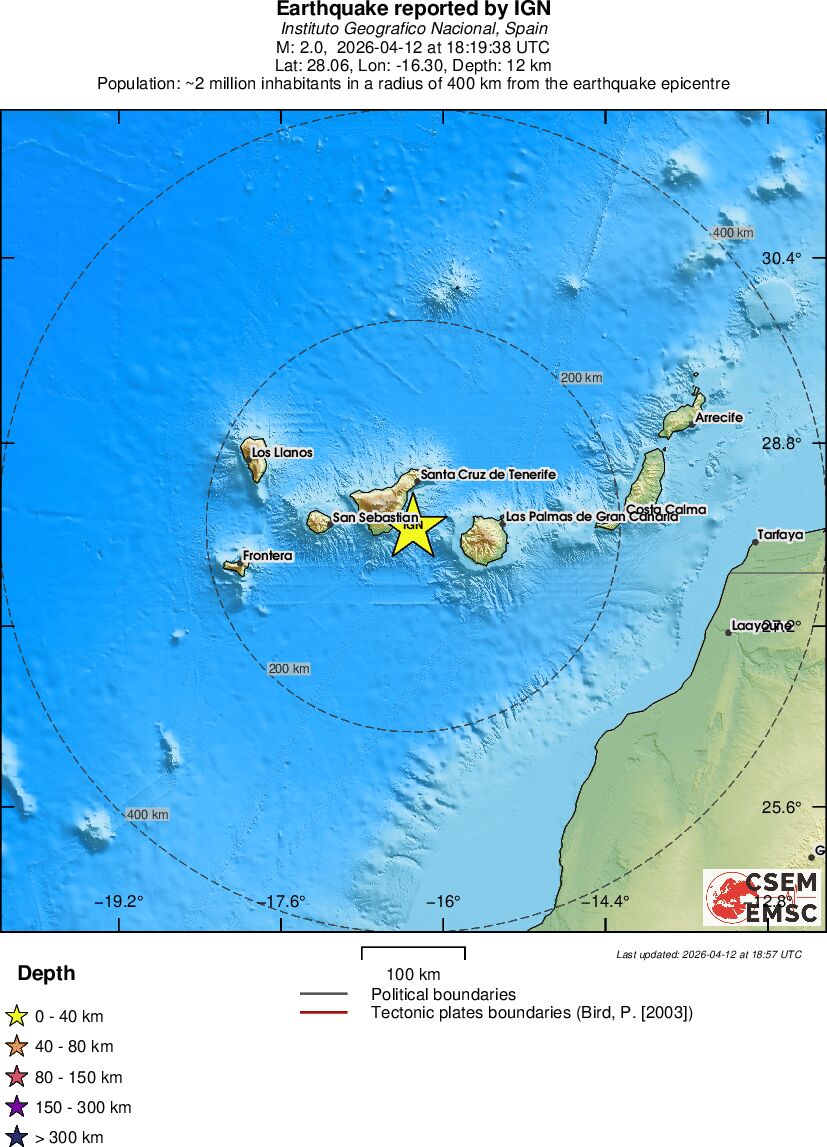 | 2 | 12.1 | 11168 | 04:19 | Link | Terremoto menor - CANARY ISLANDS, SPAIN REGION - Hoje |