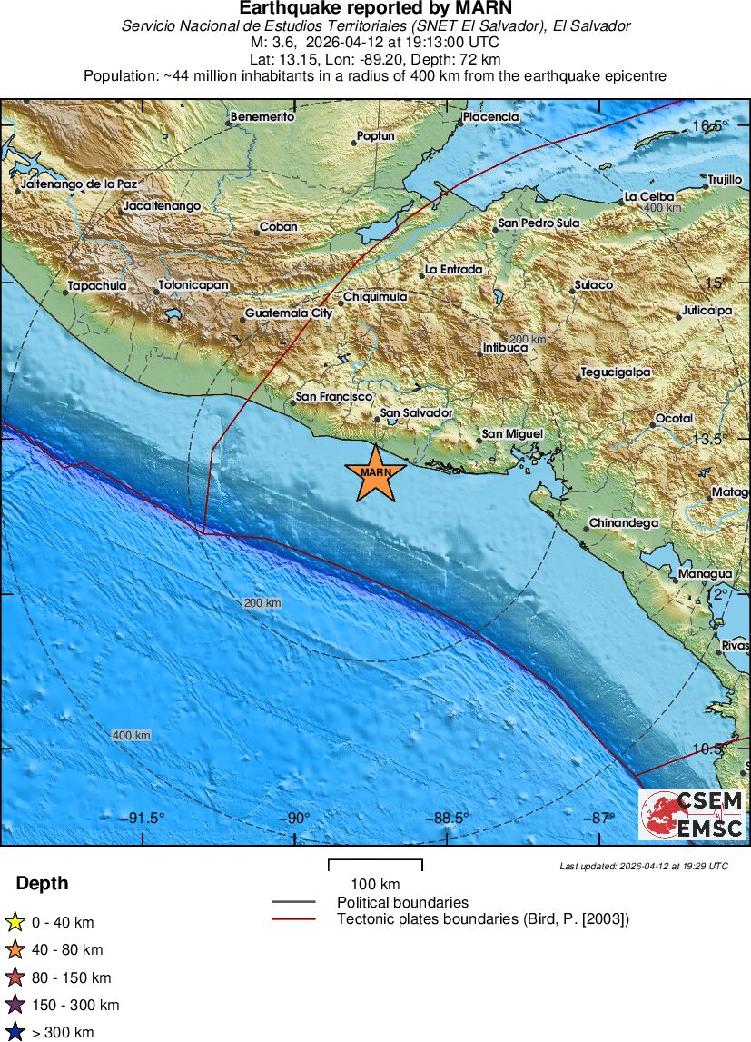 | 3.6 | 72.3 | 8491 | 05:13 | Link | Terremoto menor - OFFSHORE EL SALVADOR - Hoje |