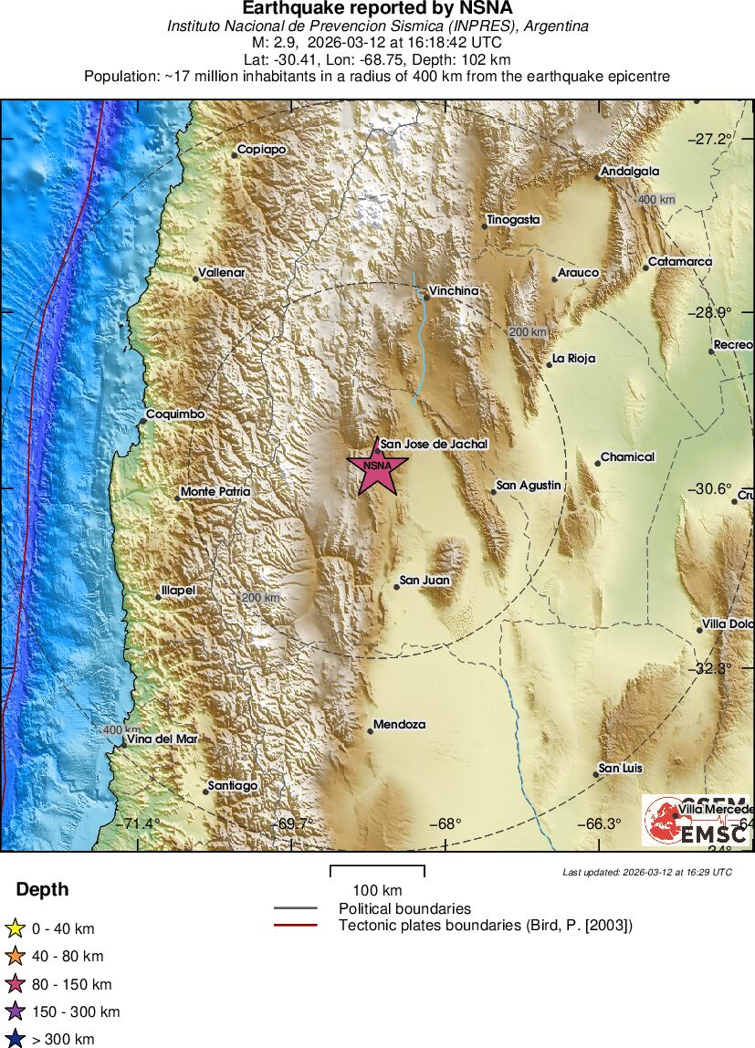 | 2.9 | 102 | 6940 | 03:18 | Link | Mindre jordskælv - SAN JUAN, ARGENTINA - I dag |