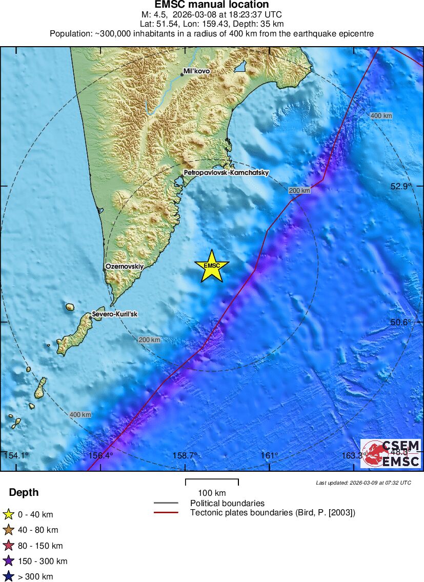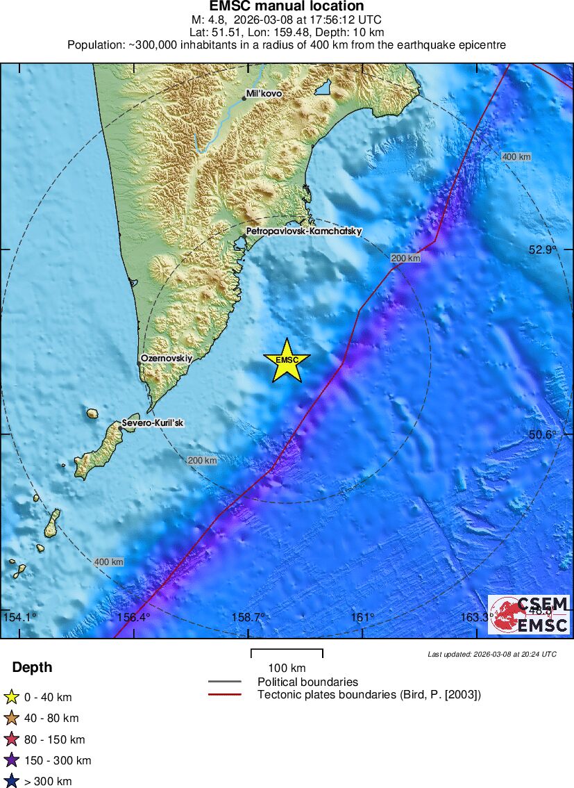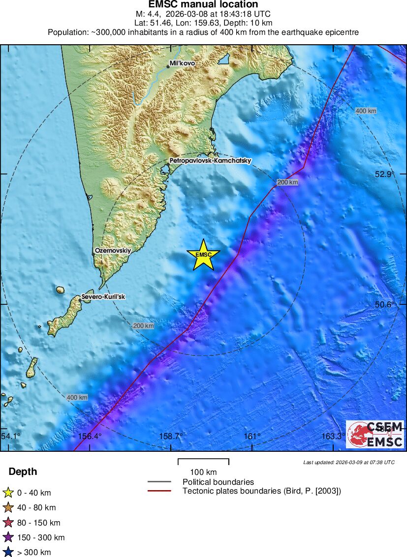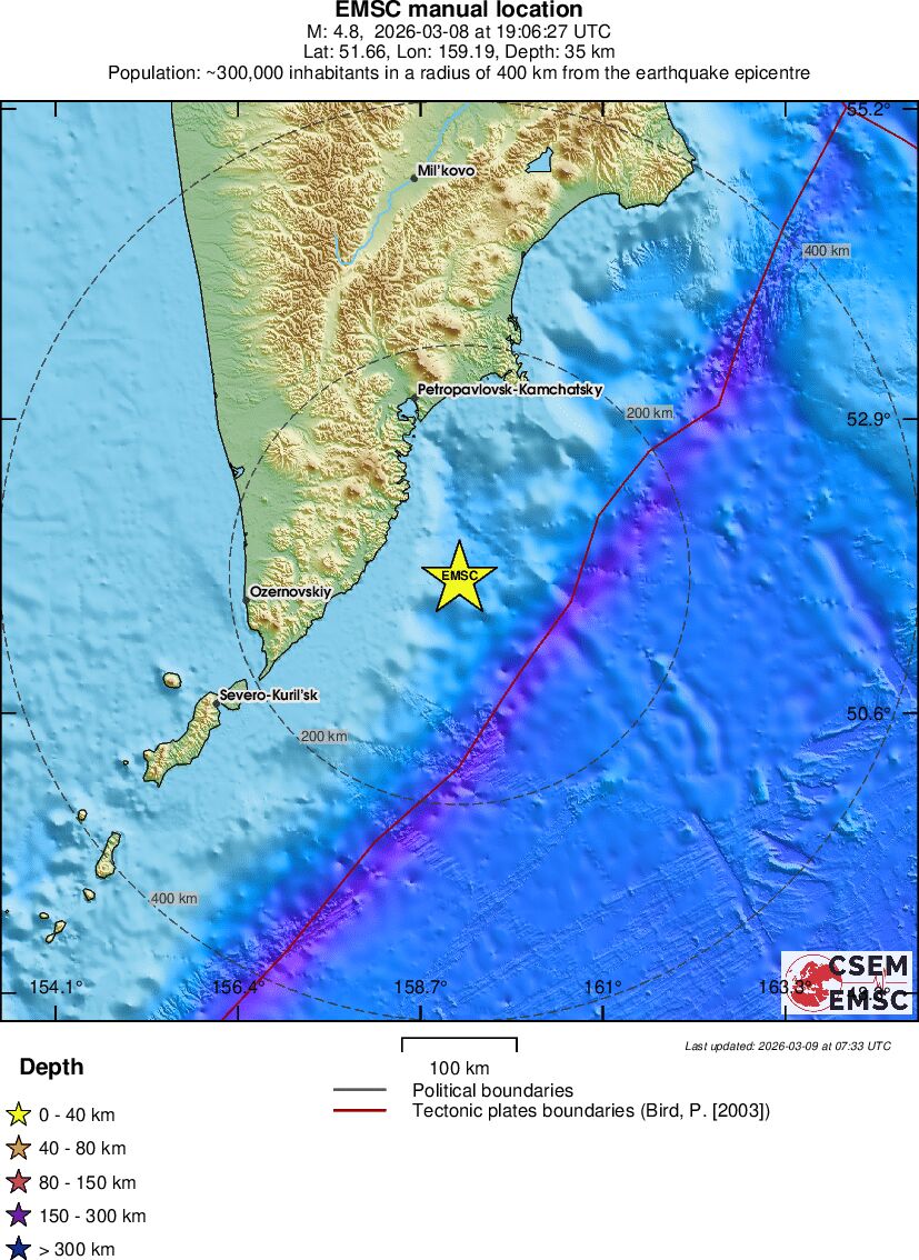 | 4.8 | 35 | 10400 | 06:06 | Σύνδεσμος | Ελαφρύς σεισμός - OFF EAST COAST OF KAMCHATKA - σήμερα |