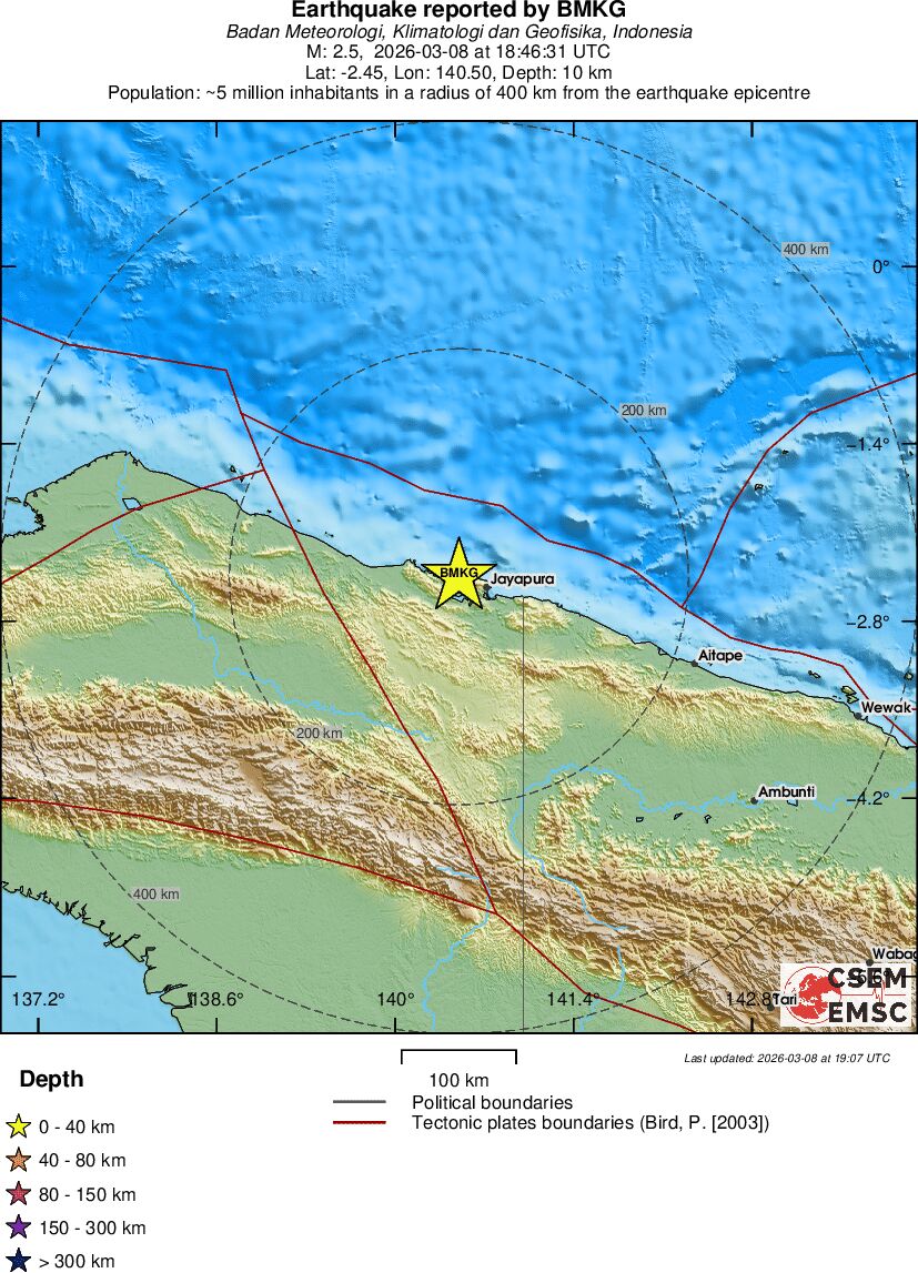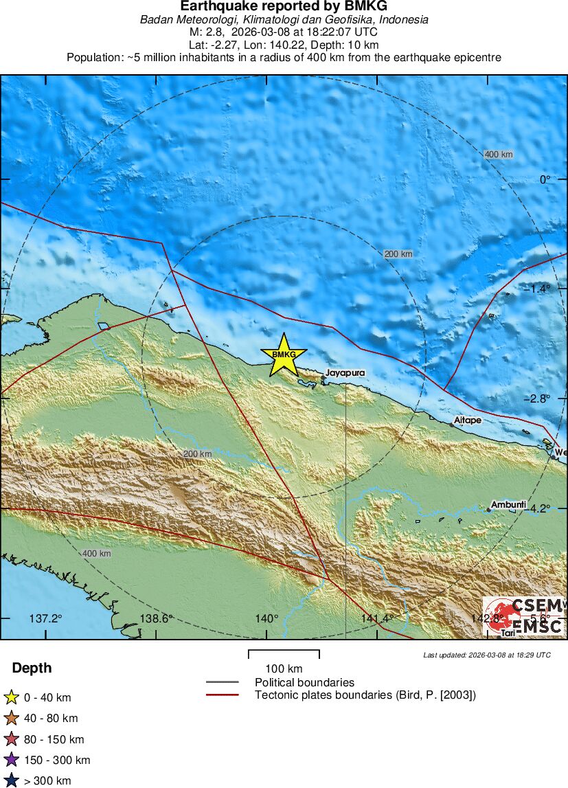 | 2.8 | 10 | 4428 | 05:22 | Σύνδεσμος | Μικρός σεισμός - NEAR N COAST OF PAPUA, INDONESIA - σήμερα |