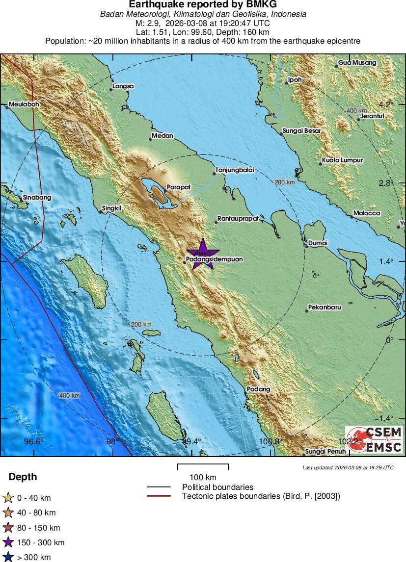 | 2.9 | 160 | 6836 | 06:20 | Σύνδεσμος | Μικρός σεισμός - NORTHERN SUMATRA, INDONESIA - σήμερα |