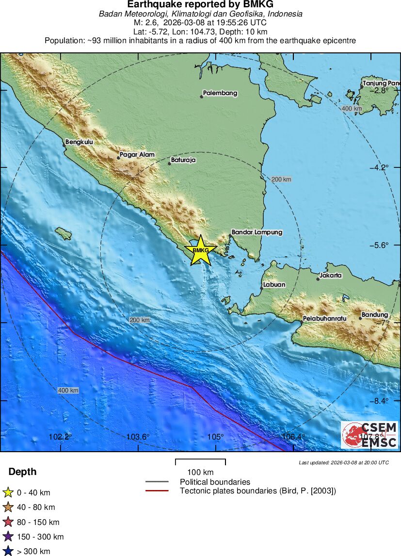 | 2.6 | 10 | 5854 | 06:55 | Σύνδεσμος | Μικρός σεισμός - SOUTHERN SUMATRA, INDONESIA - σήμερα |