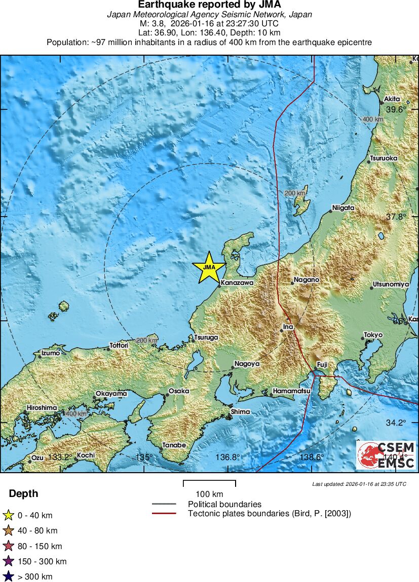 | 3.8 | 10 | 5464 | 10:27 | Länk | Mindre jordbävning - NEAR WEST COAST OF HONSHU, JAPAN - I dag |