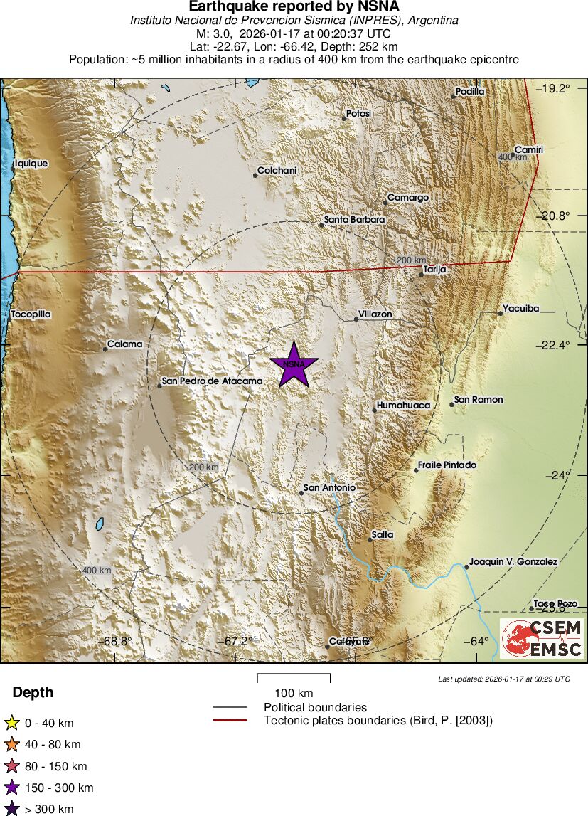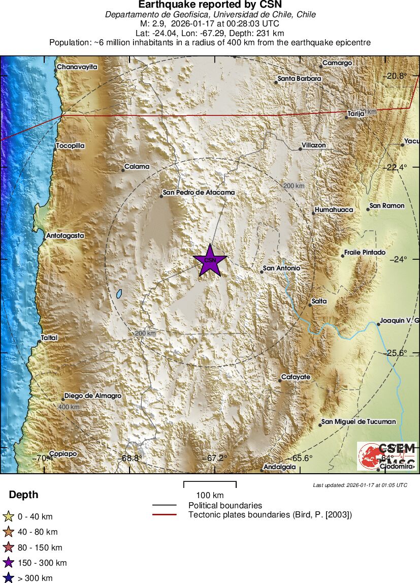 | 2.9 | 231.1 | 7373 | 11:28 | Länk | Mindre jordbävning - SALTA, ARGENTINA - I dag |
