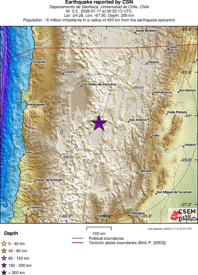 | 3.3 | 199.8 | 7352 | 11:32 | Länk | Mindre jordbävning - SALTA, ARGENTINA - I dag |