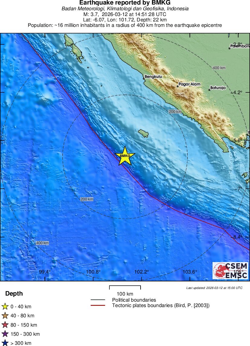 | 3.7 | 22 | 3756 | 01:51 | Vezu | Mali zemljotres - SOUTHWEST OF SUMATRA, INDONESIA - Danas |