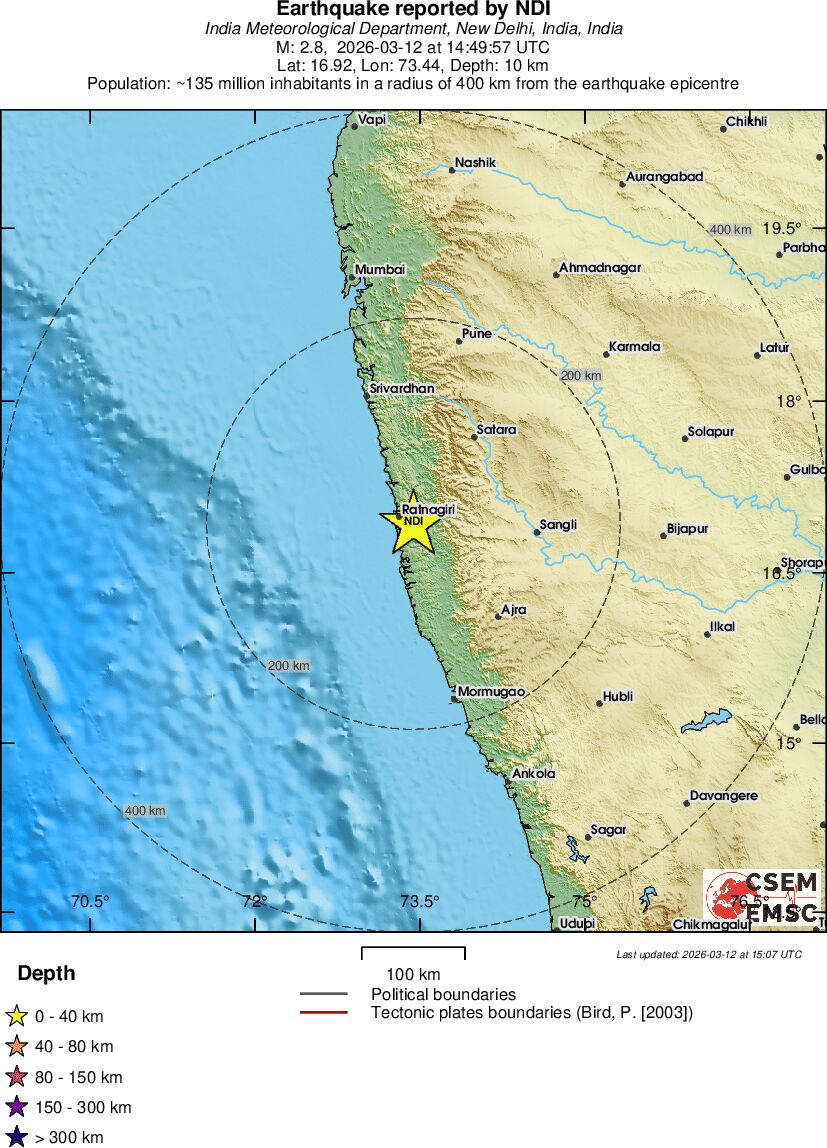 | 2.8 | 10 | 6238 | 01:49 | Vezu | Mali zemljotres - NEAR COAST OF MAHARASHTRA, INDIA - Danas |
