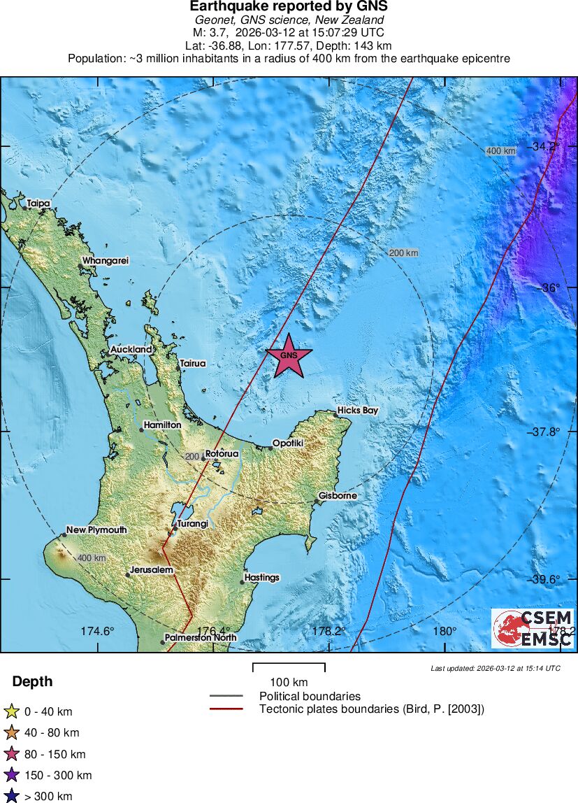 | 3.7 | 143 | 1593 | 02:07 | Vezu | Mali zemljotres - OFF E. COAST OF N. ISLAND, N.Z. - Danas |